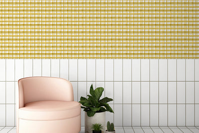 We narrowed down two stunning designs. Our Stirling wallpaper features a subtle yellow plaid design that remains versatile enough to be used as a pop of color that does not overwhelm a space. Vista 8 is a wallpaper done by our in-house talent, featuring brushstrokes indicative of a warm, yellow horizon setting on a darker hillside.
