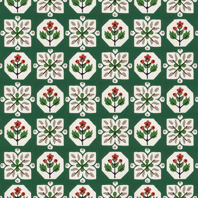 Prinos features a Scandinavian-inspired tile design with pops of red winterberry motifs and leafy greenery. This bold pattern can add a cozy touch to any space, making it ideal for softening up a harsh or dark area. Part of our 1940s-1950s wallcovering collection, this is digitally printed to order and can be customized in scale, color, and material.