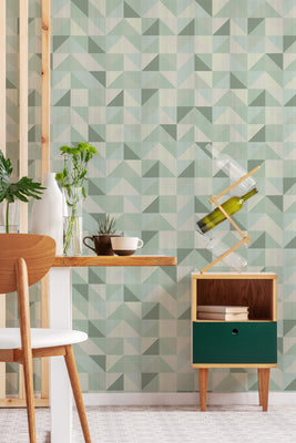A subtle wood grain texture softens this geometric pattern. Presented in a palette of pistachio and mint green, Wooden Geometric can be customized in color, scale, and design to suit your aesthetic.